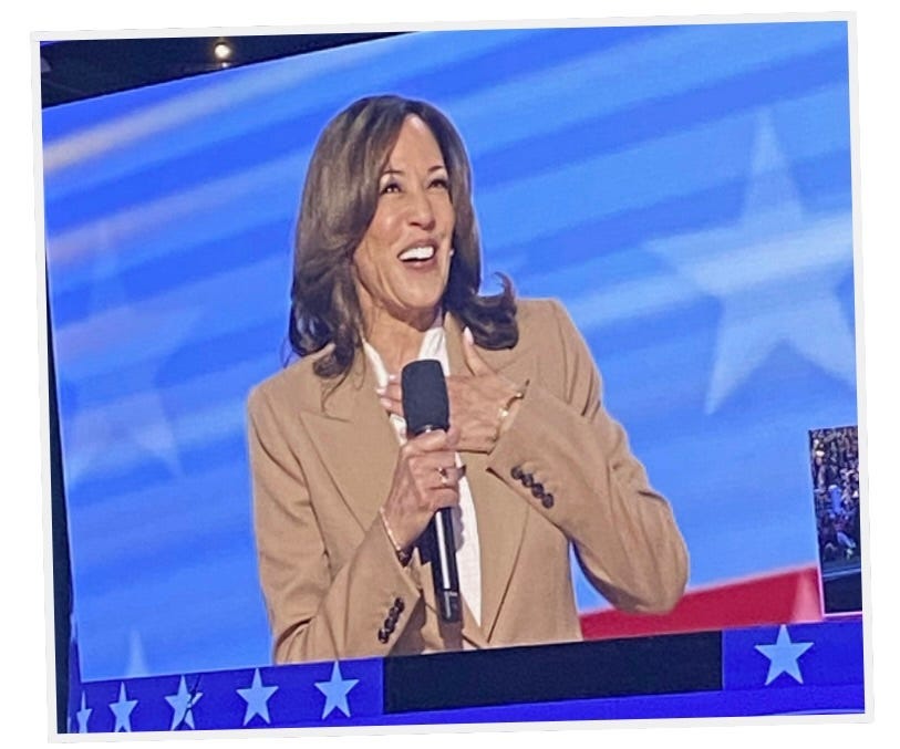 BIG PICTURE Democratic presidential nominee Kamala Harris, as seen on the big screens inside the DNC Monday night. (Alison Brower)