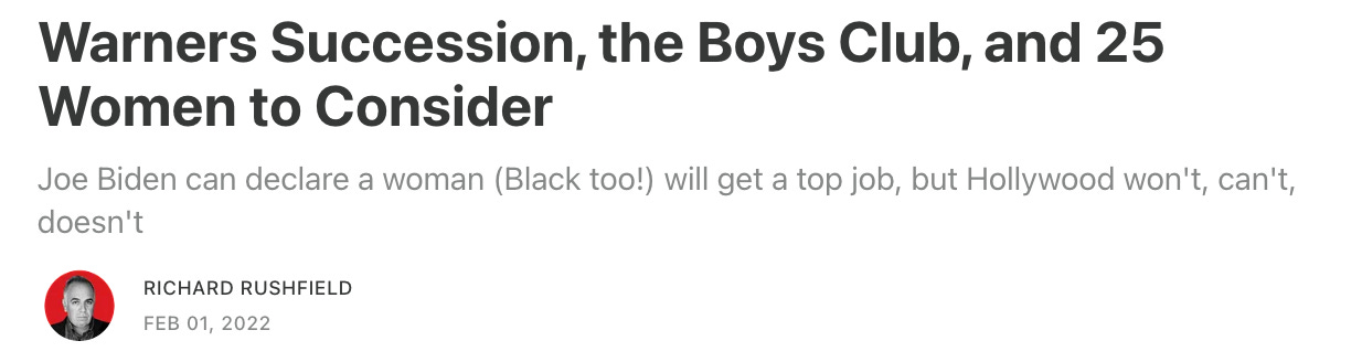 This week we introduce Mount Rushmore, a series of encore columns from Richard Rushfield with newfound resonance today. On Feb. 1, 2022, Richard wrote about the beauty pageant underway as the chief of a soon-to-merge WBD, David Zaslav, interviewed potential candidates to sit atop the studios right below him, the job held under AT&T ownership by Jason Kilar. Every name — and there were many — was male. Which prompted Richard to assess just what kind of profile is constantly, consistently, always in contention for the top jobs in entertainment, and the 25 women who could/should at least be considered for the highest offices in Hollywood. To this day, our big streamers and studios have not and never had one single female CEO sitting at the very top.