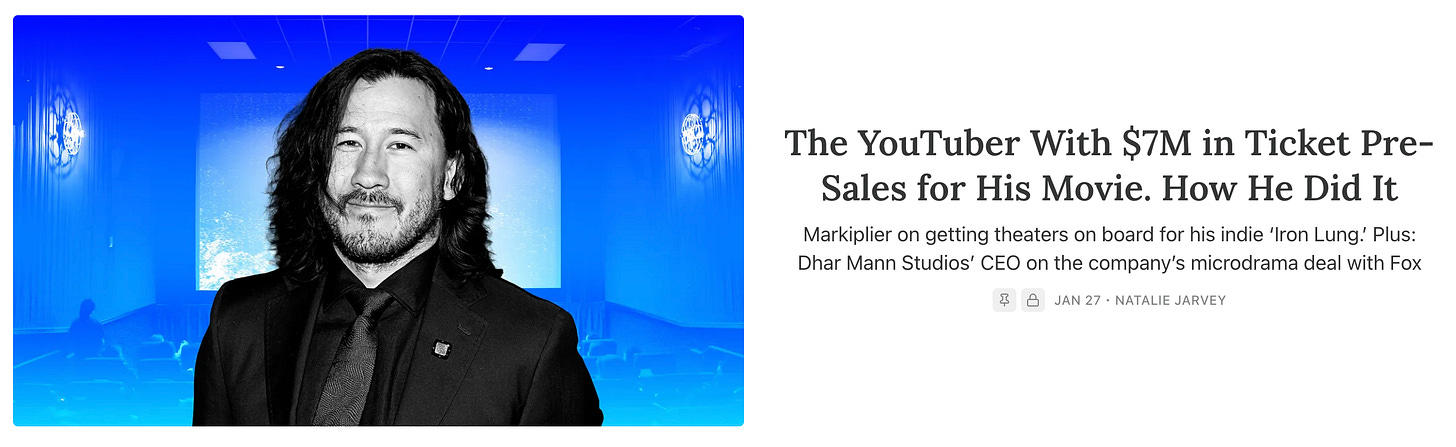 Sean McNulty will have his full autopsy of Melania’s box office later today in The Wakeup. In the meantime, the very indie Iron Lung is shaping up as one of the weekend’s real surprises, tracking toward a $17 million finish — nearly double expectations — thanks to the gravitational pull of its writer-director-star, Markiplier (Mark Fischbach).