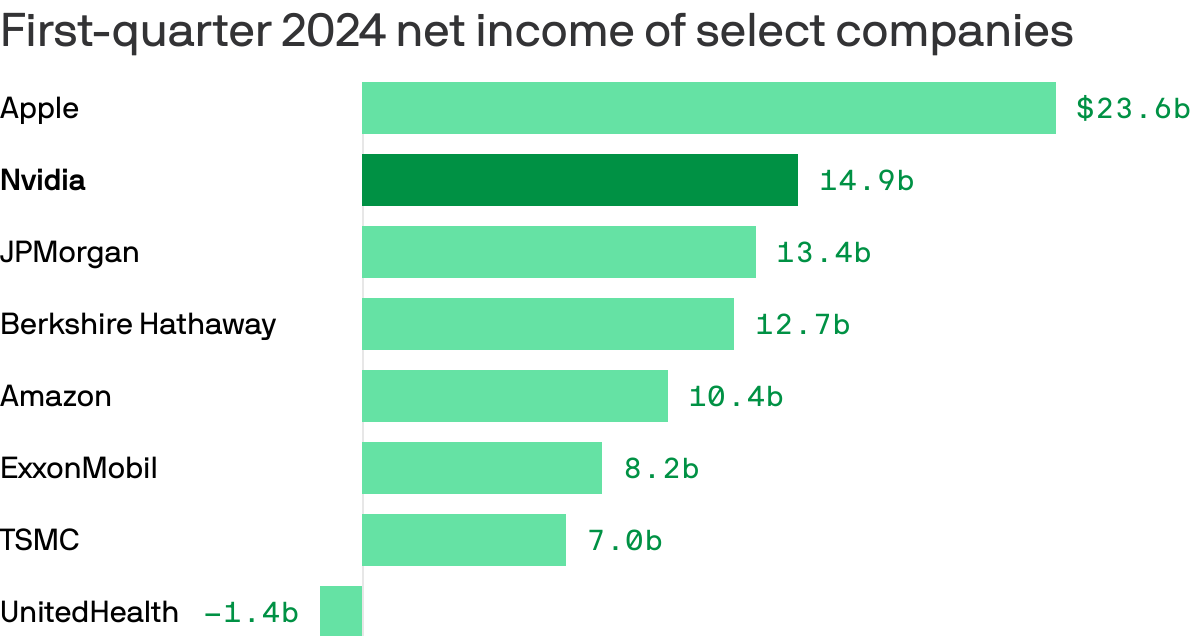 $14.7B of 💰 profit on $26B of income — not a bad Q1 at NVIDIA. In addition to APPLE here on this chart, MICROSOFT and GOOGLE were the only companies to make more profit in Q1.