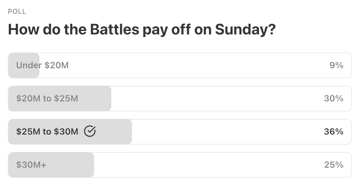 WB One Battle After Another — I’m optimistic . . . but honestly, I think the wide $20M to $30M numbers out there could really go either way. I’m still buying Chase Infiniti career stock after this movie, regardless.