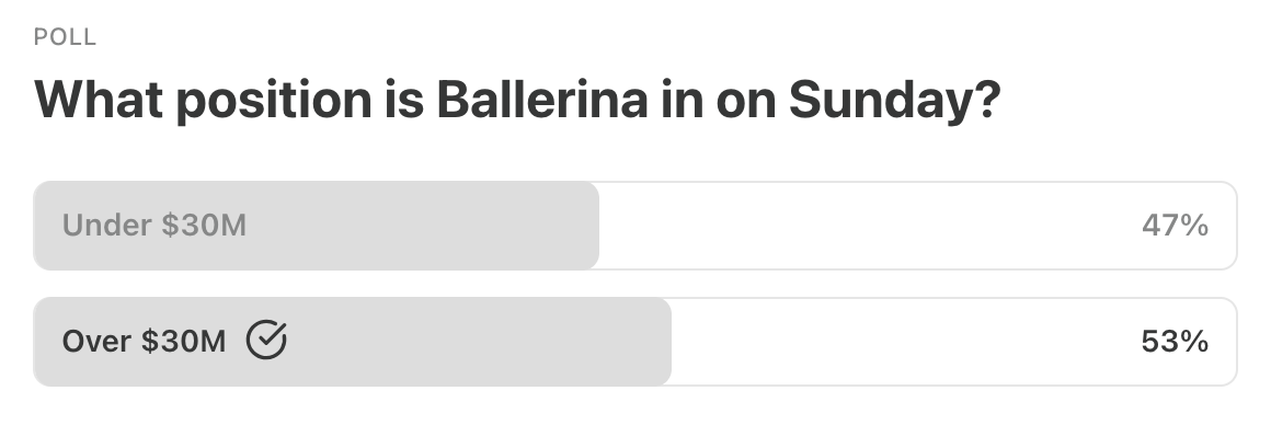 I’ll take the over on Ballerina, along with the slim majority of y’all.
