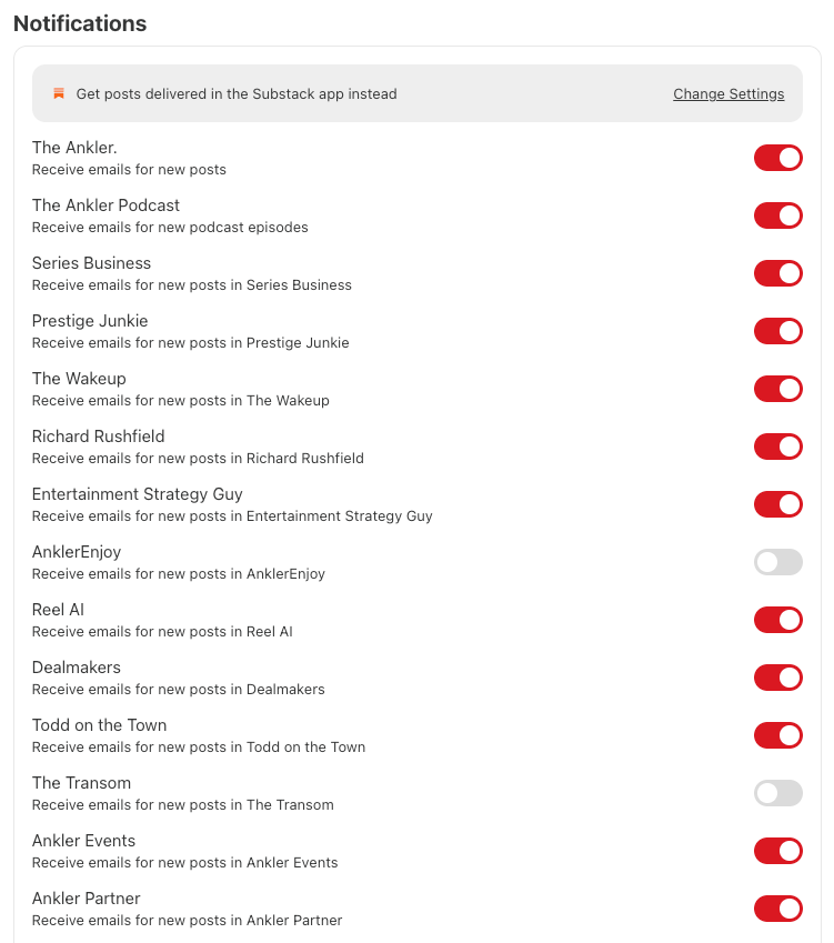 As an Ankler subscriber, you are automatically subscribed to all of our newsletters and podcasts by default. Not interested in all of them? Customize which ones would like to receive notifications for. It’s easy to do.