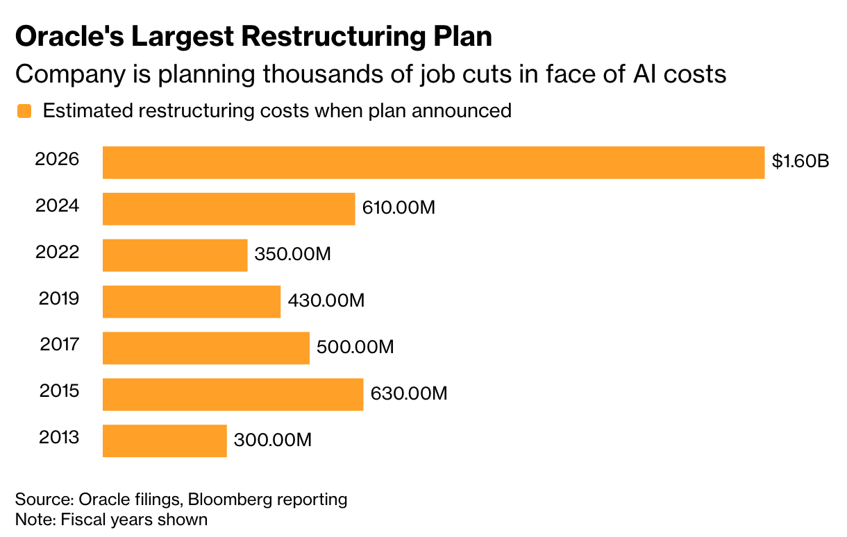 This is in reaction to an AI data center construction-induced cash crunch at the company, according to Bloomberg. This need for cash is seemingly boosting the “restructuring” costs ORACLE has earmarked for FY26 (which ends in May) by about 3x over previous years.