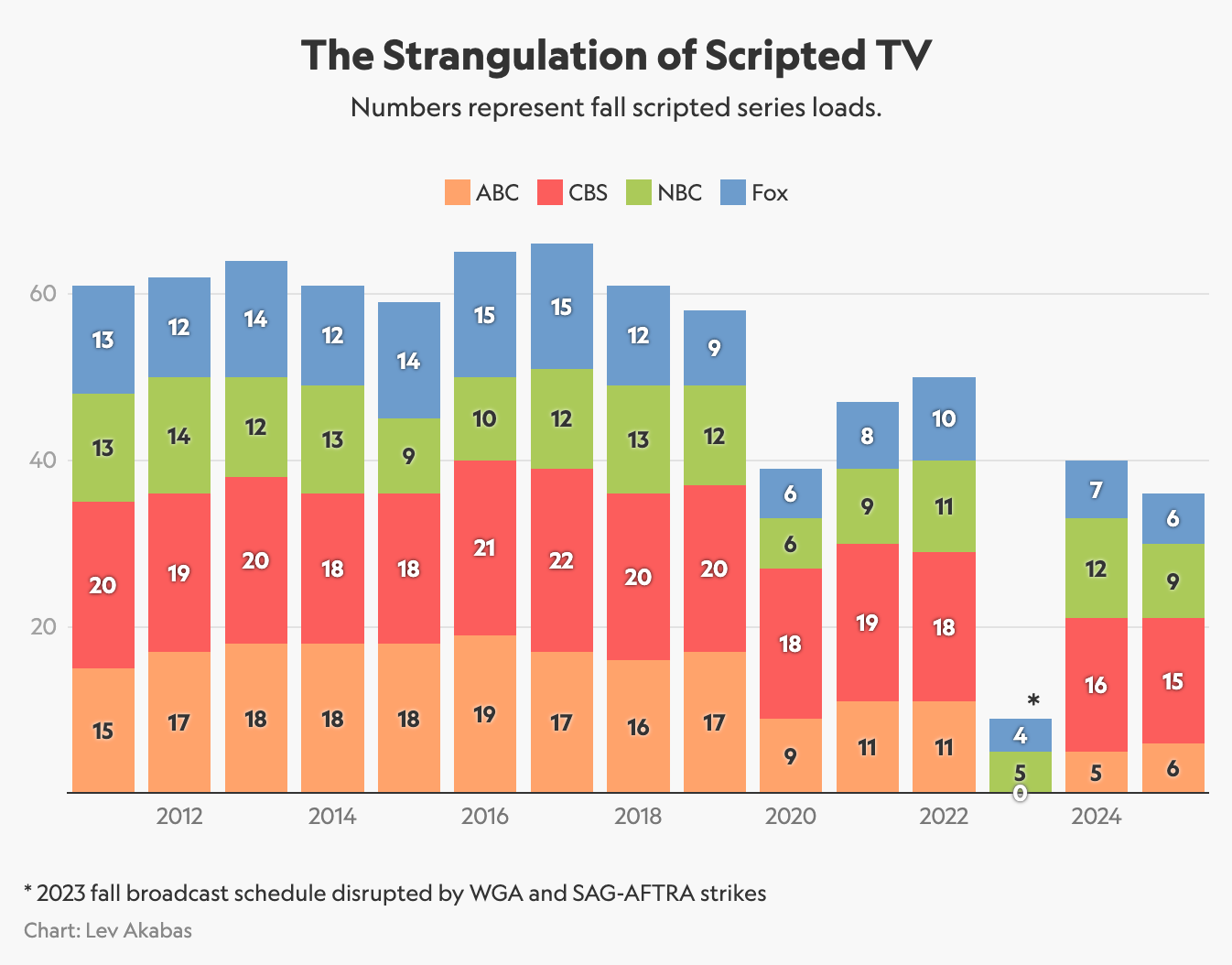 AH: Here’s a snapshot for ya re: the changes Hollywood (incl. writers/actors) have undergone in the past eight years — the “Big 4” broadcast networks have 36 scripted TV shows on their September schedules combined. In 2017, that number was 66.