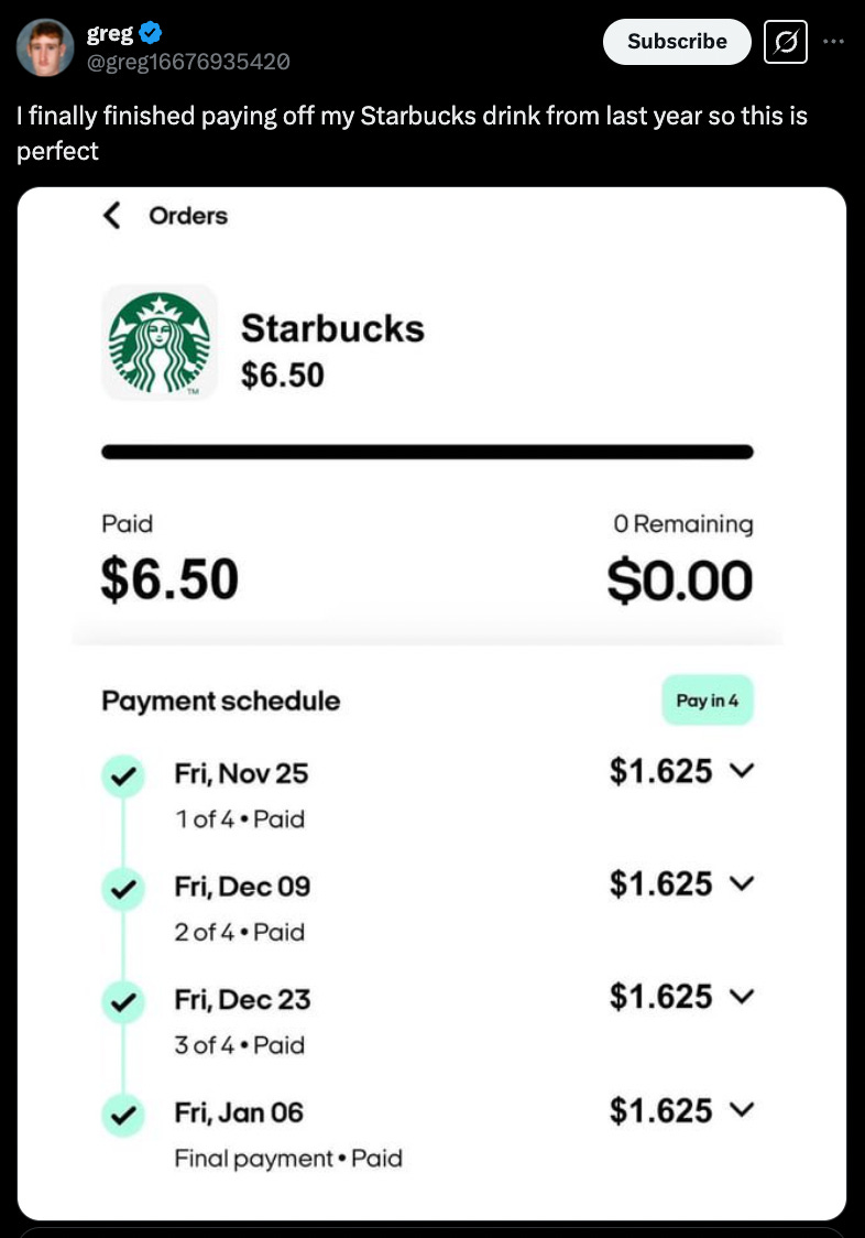 But yes — the advanced future we’ve long been promised has finally arrived . . . as DOORDASH’s new agreement with KLARNA means you can now pay for your SWEETGREEN salad on, essentially, layaway.