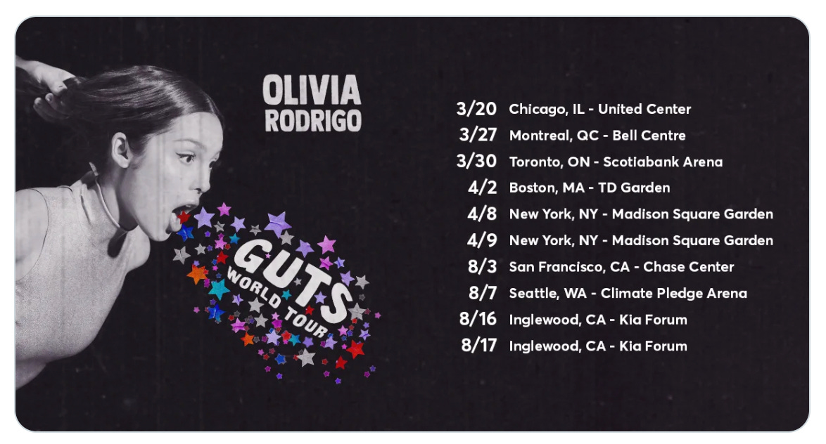 AND: Olivia Rodrigo added more dates to her tour 👇, including additional shows in NY and LA, although pre-registration for tickets closed yesterday (they go on sale Weds).