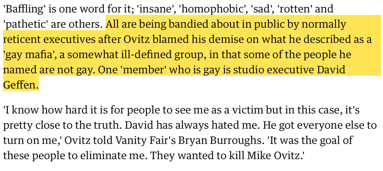And earlier, in 2002, the term “Velvet Mafia” (David Geffen, Barry Diller and Sandy Gallin usually topped the rumored list) was in full swing. And Mike Ovitz memorably was assailed for blaming his career trajectory to the group.