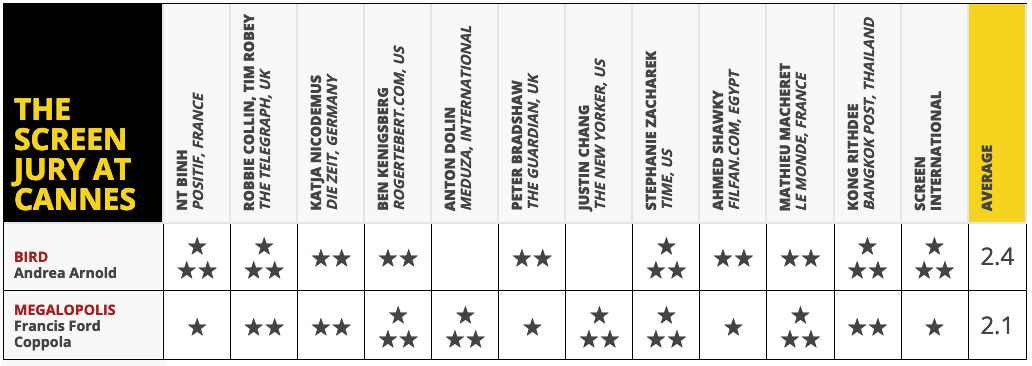 The long-running Screen International Jury Grid is a critical ranking of competition films in Cannes, according to an assembled jury of 12 international film critics, including Screen's reviewers. Today’s latest features Coppola’s Megalopolis as well as Andrea Arnold’s Bird (click on image for the full grid):
