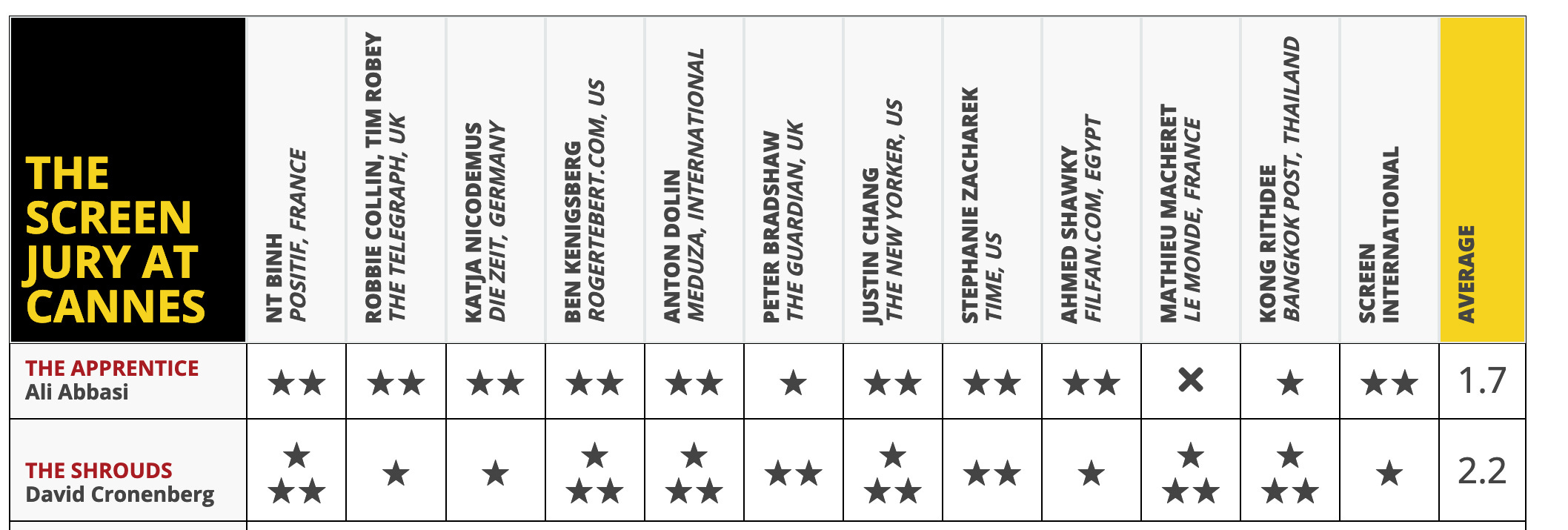 The long-running Screen International Jury Grid is a critical ranking of competition films in Cannes, according to an assembled jury of 12 international film critics, including Screen's reviewers. Click here for today’s full grid and accompanying story, with The Apprentice and Cronenburg’s The Shrouds making their debuts but not approaching the more positive response for such films as The Substance.
