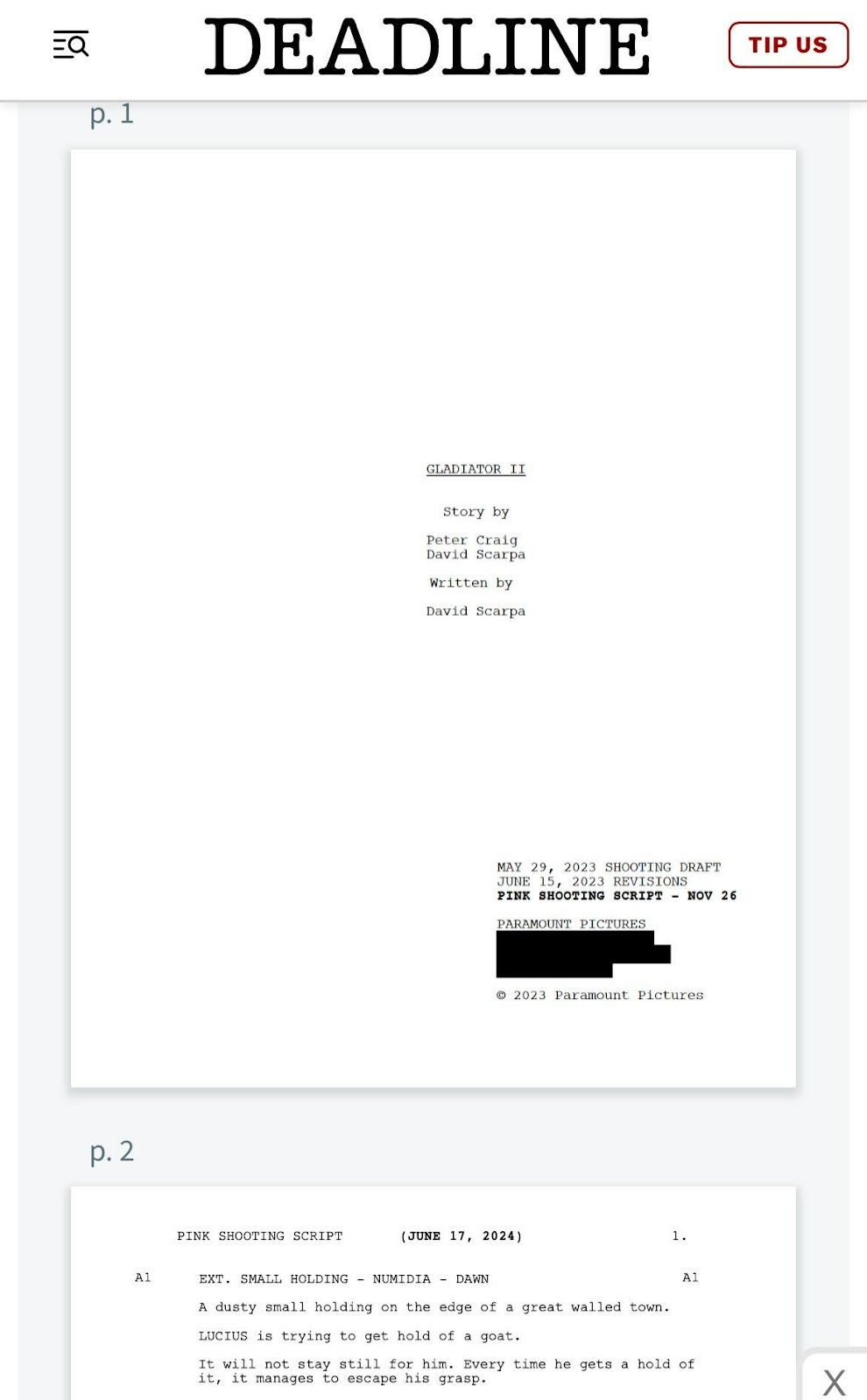 It was a screengrab of the cover sheet of the script to Paramount Pictures’ Gladiator II, which had been posted in full over on Deadline as part of its FYC Screenplay Series. The draft dates immediately raised eyebrows: The shooting draft was dated May 29, 2023, while the revisions were dated June 15, 2023. That seemed to indicate that additional drafts had been filed during the first month or so of the Writers Guild of America strike, which officially began on May 2 last year, when scribes had declared pencils down.