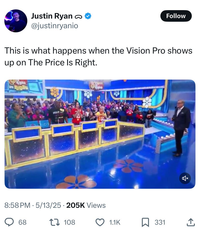 In just the perfect 🤌 to go with it — this CBS TPIR clip this month really says it all about how much America really thinks something like the Vision Pro is worth. Not sure this is the ROI APPLE was looking for on this placement.