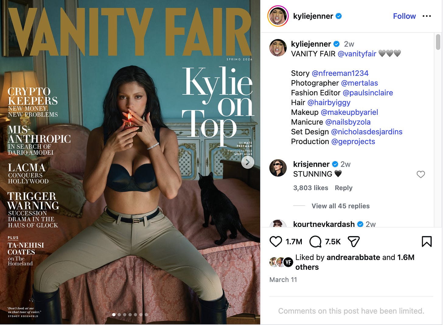 Magazines also promote butts as glamorous props, from Kylie Jenner on the cover of the latest Vanity Fair to Love Story star Paul Anthony Kelly and Sabrina Carpenter in Interview and Marty Supreme’s Odessa A’Zion in W. Last November, the fashion research firm Style Analytics reported a 70 percent year-over-year increase in U.S. searches for the term “smoking pose” among people aged 18 to 24 — a demographic that, until recently, had been defined by its move away from traditional cigarettes.