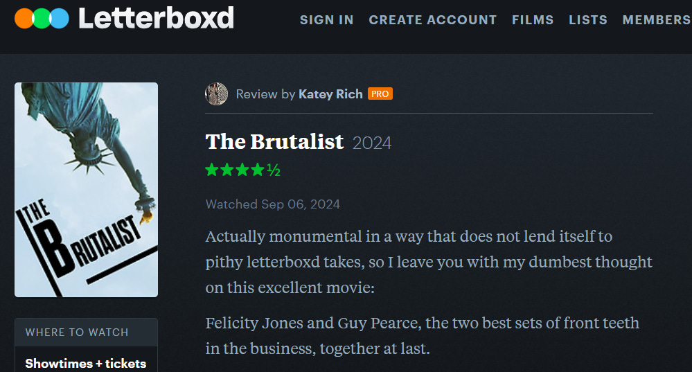 Following Megalopolis’ doomed effort to turn critics’ words back on them with its AI-mangled trailer, there’s something diabolically clever about A24’s first trailer for The Brutalist. “Monumental” is exactly the word you want to use to promote a historical epic about an architect, and when it’s been used by five different critics you may as well put it in the biggest font possible, even if it might make the critics in question wish they’d consulted a thesaurus. I am not quoted on the poster, but I am also guilty as charged: