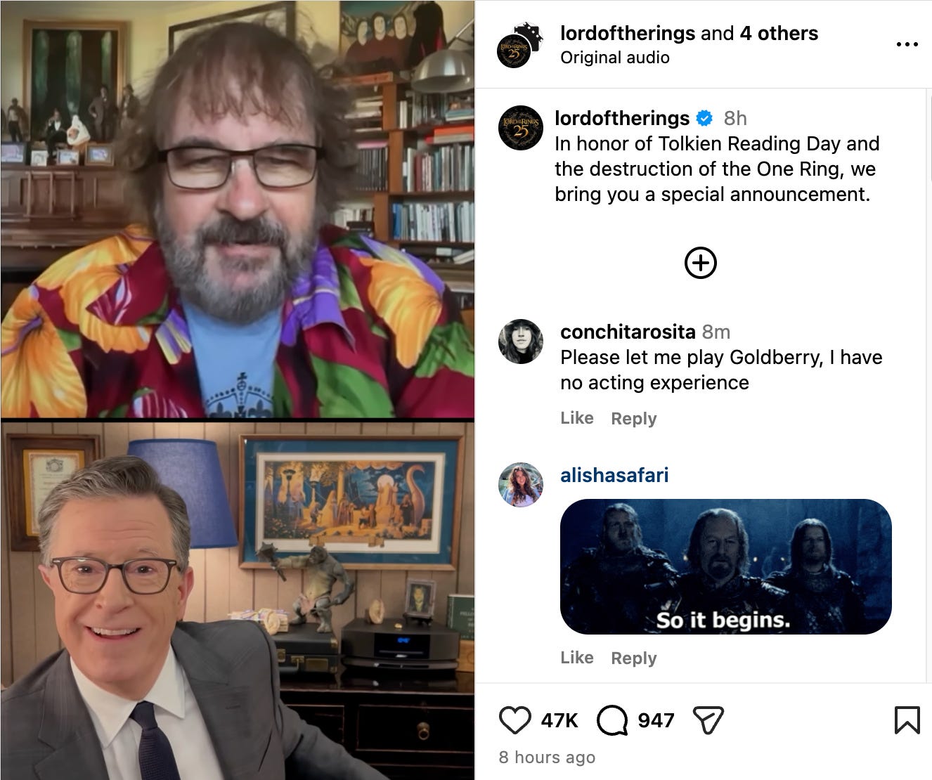 BUT: Stephen Colbert has lined up his next gig! Or at least one of them . . . writing a new LOTR pic at WB/NLC, with a working title of LOTR: Shadow of the Past and based on “Fog on the Barrow-downs,” the 8th chapter of The Fellowship of the Ring, if that means somethin’ to ya.