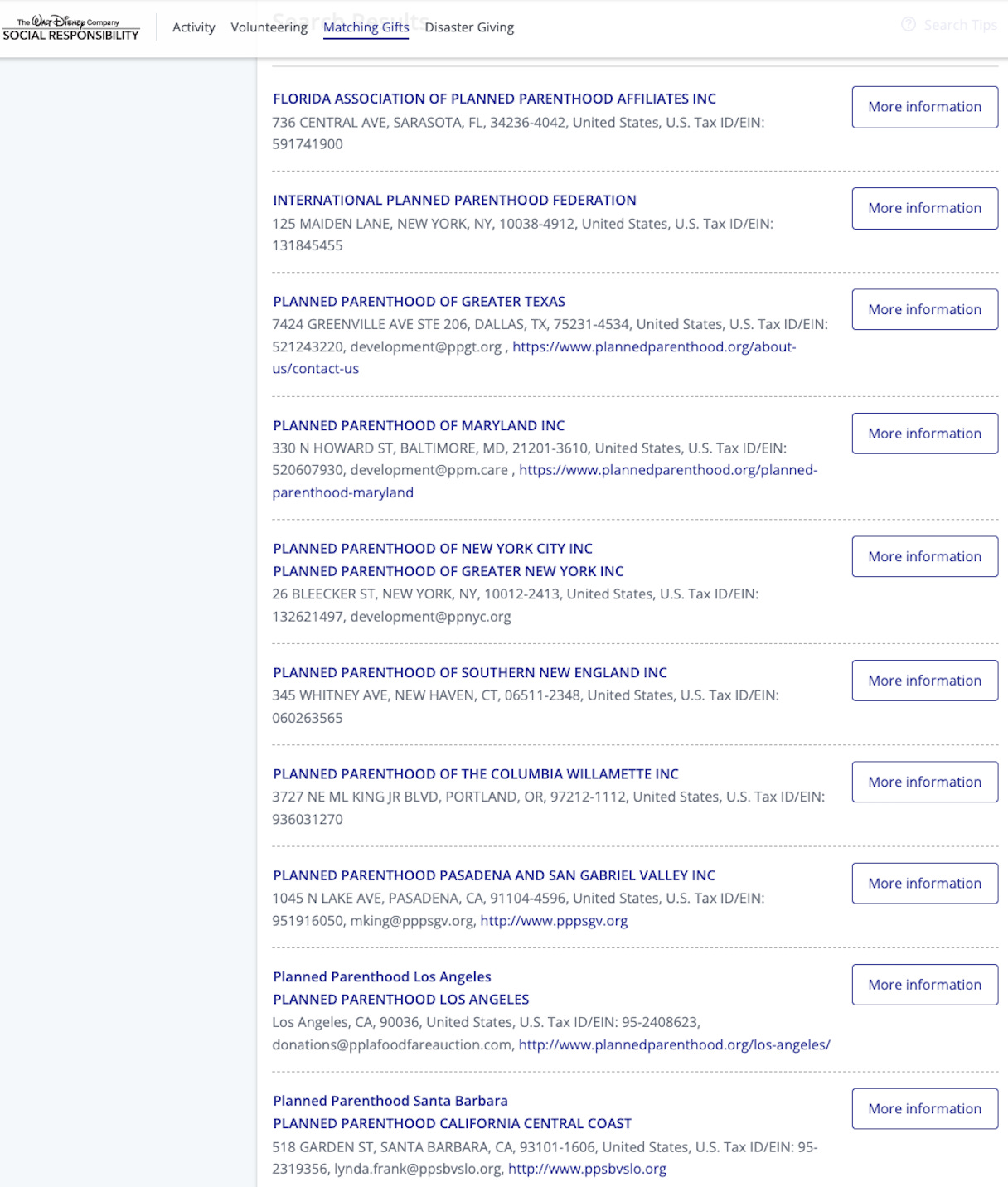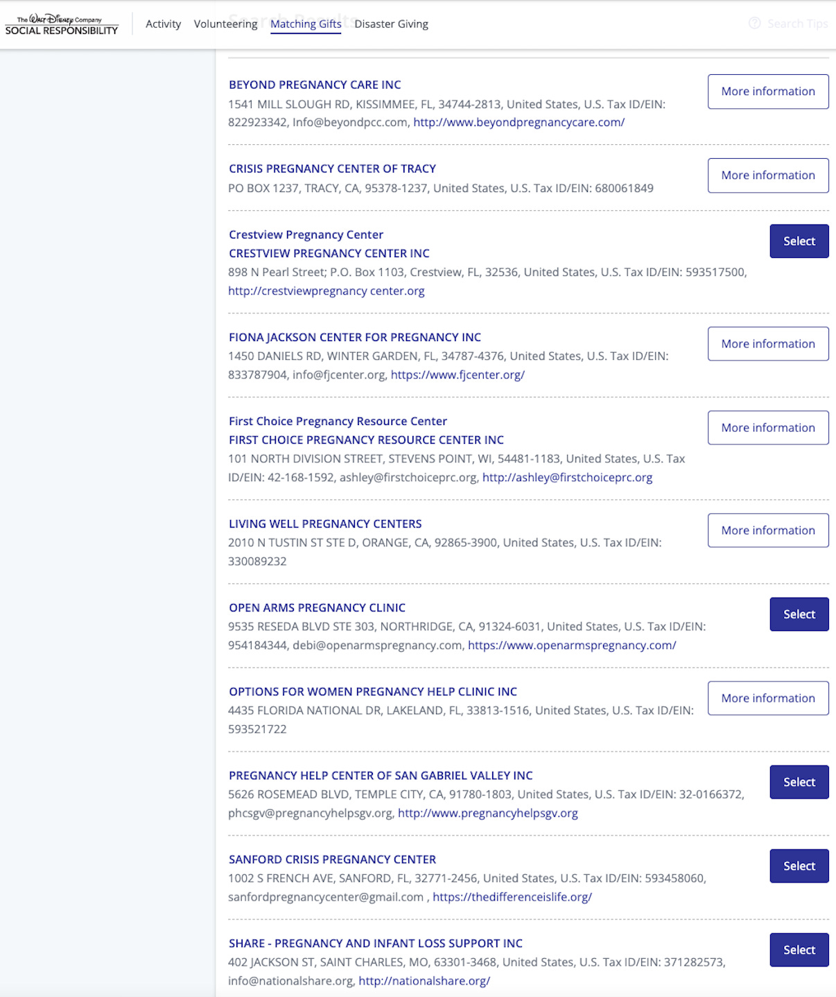 On Friday, in the wake of the high court’s ruling, Disney joined dozens of other companies pledging to cover employee travel costs for “family planning” for employees who can't access care where they live. That includes “pregnancy-related decisions”. Disney’s matching program does have some anti-abortion (or at the very least pro-life-adjacent) non-profits and charities. For example, employees can donate to Florida-based Sanford Crisis Pregnancy center which, according to its website, lays out it’s mission as such: