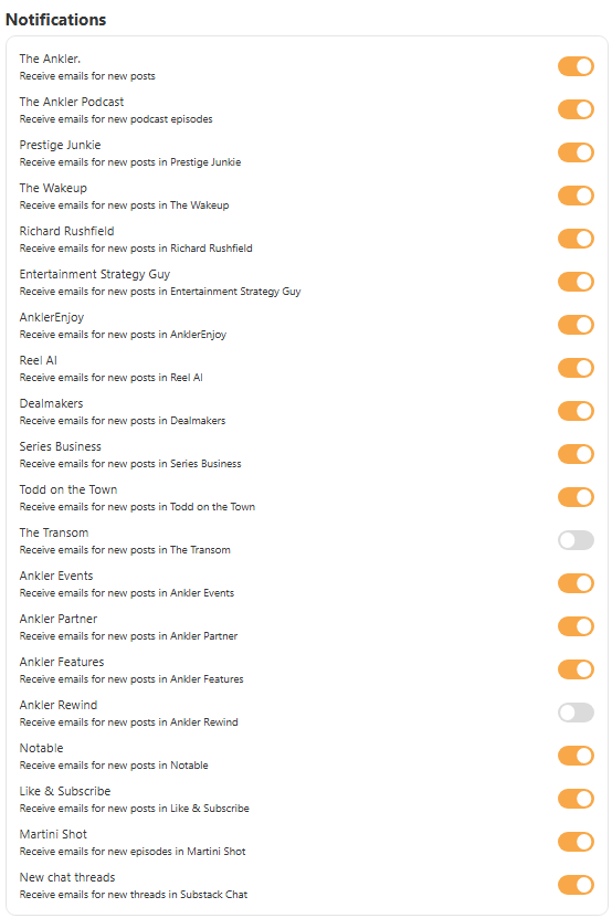THEN: Just a reminder — you can customize which Ankler newsletters you’d like to get in your inbox. SUBSTACK lists steps here, or these are the basics: