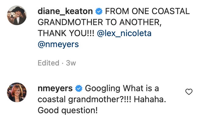 “Coastal grandmother is Martha Stewart-adjacent,” Lex explains in her seminal video. “Not fully Ina Garten. Think Nancy Meyers’ chic. It’s Diane Keaton and Something’s Got to Give. It’s Meryl Streep and It’s Complicated.”