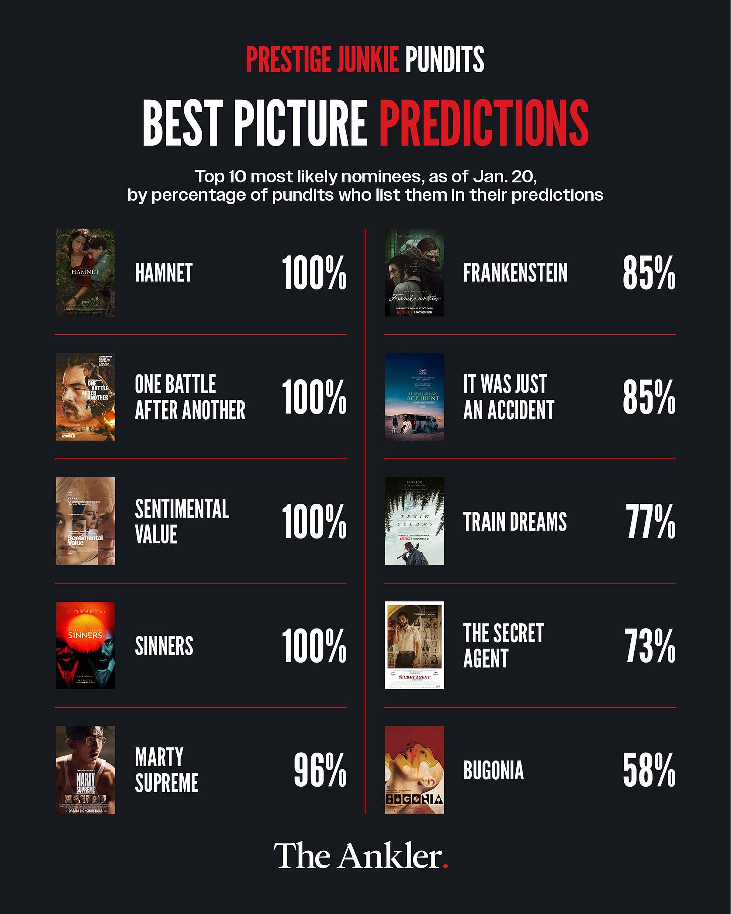 If you believe the best picture leaderboard over at our Prestige Junkie Pundits page, there are a whopping seven films with a greater than 80 percent chance of being nominated: Frankenstein, Hamnet, It Was Just An Accident, Marty Supreme, One Battle After Another, Sentimental Value and Sinners. But I think if you asked each of those pundits individually, theyâd tell you nothingâs ever really that certain. Confident as we all may feel in our Oscar predictions with just two days to go before theyâre announced, anyone who loves watching awards season can tell you that itâs not a matter of if there will be surprises, but how many.