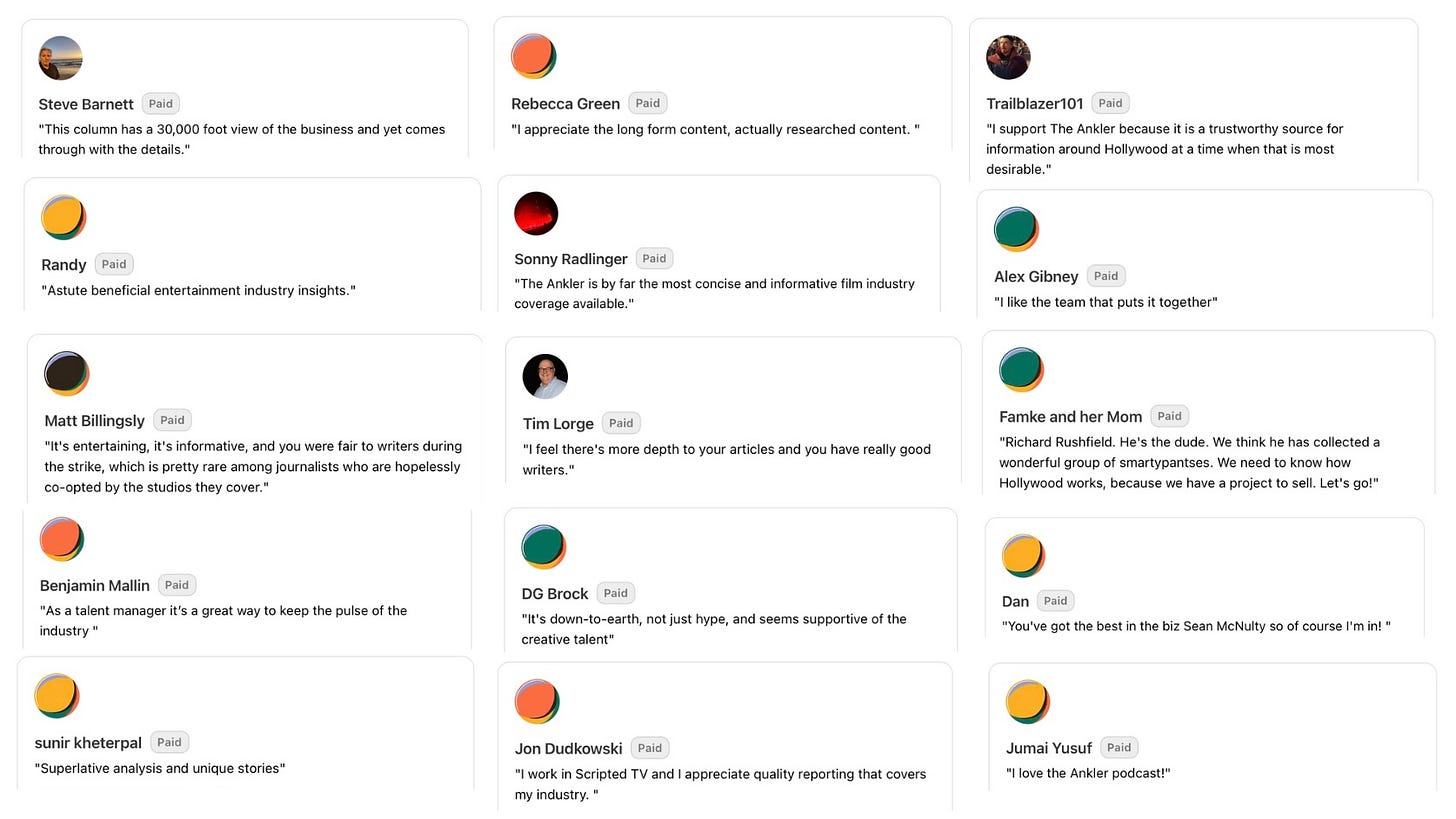 But don’t let us tell you how valuable a paid Ankler subscription is. Check out just a handful of the public comments left by our thousands of paid subscribers: