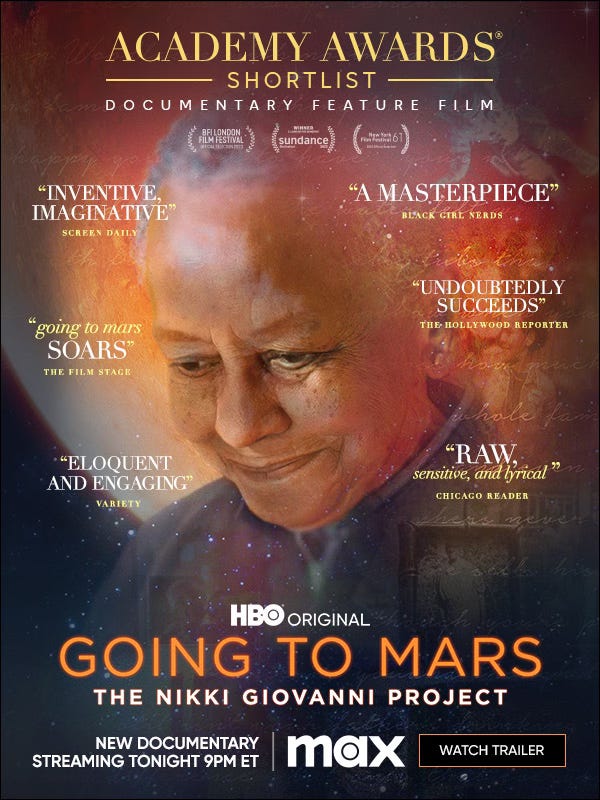 FOR YOUR CONSIDERATION: MAX, presenting the HBO Original Going to Mars: The Nikki Giovanni Project. A look at the life of poet, Nikki Giovanni and the revolutionary historical periods through which she lived, from the Civil Rights Movement to Black Lives Matter. Streaming tonight on Max.