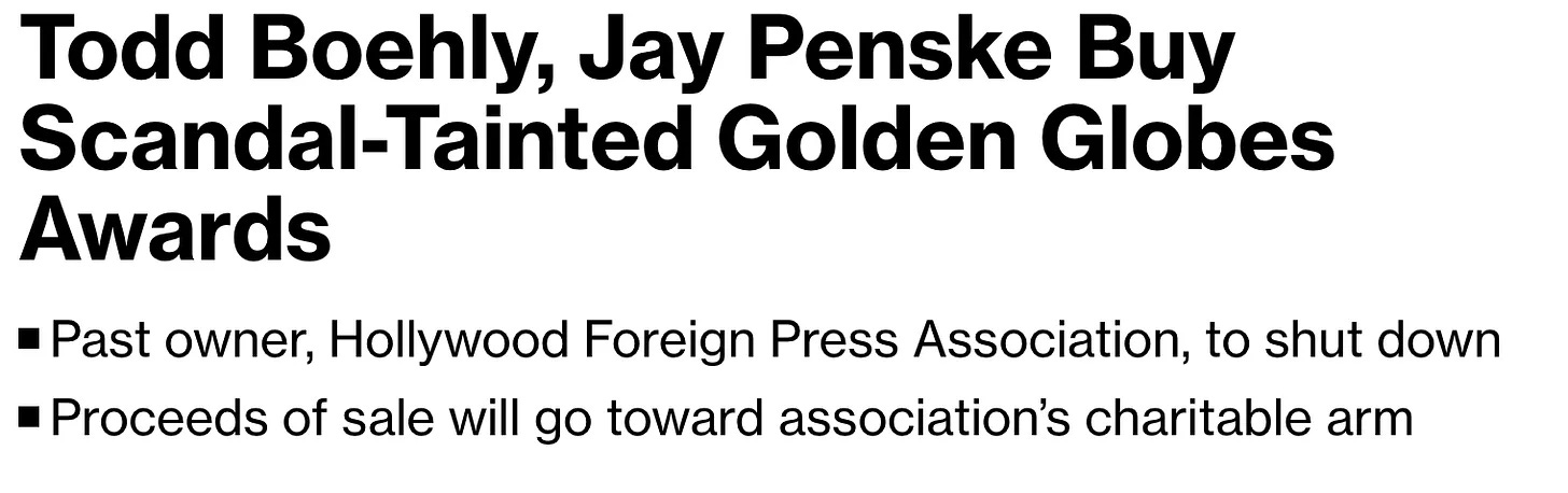 The process of acquiring the awards and the accompanying requisite dissolution of the HPFA as its governing body began when the deal was announced in June 2023 — the Penske-owned trades, L.A. Times and the New York Times all incorrectly stated that the HFPA “is no more.” I have learned that the process still requires several more rounds of votes from the HFPA to be finalized, and that at this point, no money has yet changed hands for the acquisition.