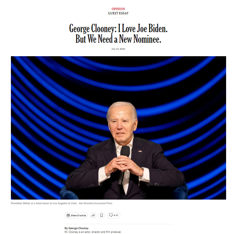 The op-ed was well written. I think he had a little rewrite help from the paper, probably because they’re not shy about that with everybody. But it made an argument, not only that he had some love for Biden, but it cut through all the BS and said, I was standing there with him, and let me tell you what I saw. And Clooney is very credible, because he’s worked in the center-left political space for a long time. So it was what I would call expert testimony.