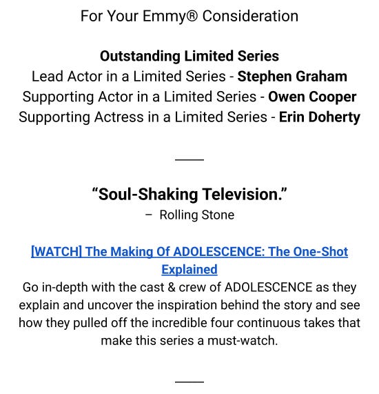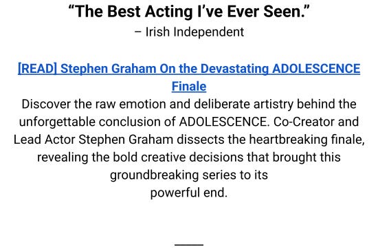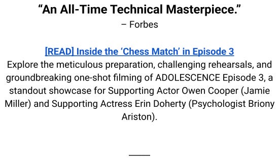 Ankler Partner Gotham Award Winner ADOLESCENCE is “The Best and Biggest Show of the Year” – An Inside Look at the Brilliance of the One-ShotJun 05, 202581SharePreviousNext