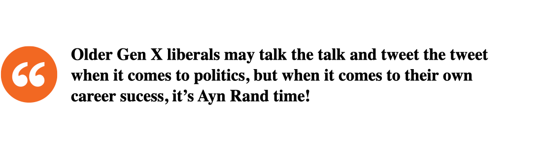 I know it sounds harsh, but I was trying to help. I knew who her boss was. He was older. A Boomer. Or maybe not technically a Boomer. A Boomer-Gen X cusp. Either way, I knew instinctively that he was the kind of person who, despite saying all the right things he’d been ordered to say in whatever HR-mandated struggle session they’d wrangled him into attending, would ultimately balk at a writer coming in late because of a therapy appointment. He and his cohort had been programmed to see missing work as laziness and asking for help as weakness. Older Gen X liberals may talk the talk and tweet the tweet when it comes to politics, but when it comes to their own career success, it’s Ayn Rand time! This guy probably had a Wellbutrin prescription and a few therapy anecdotes of his own, but an employee’s mental health wasn’t going to get in the way of making CBS’ 14th most popular show. Not on his watch. He and I were both, in our own ways, the exemplars of Hollywood’s new Mental Health Generation Gap.