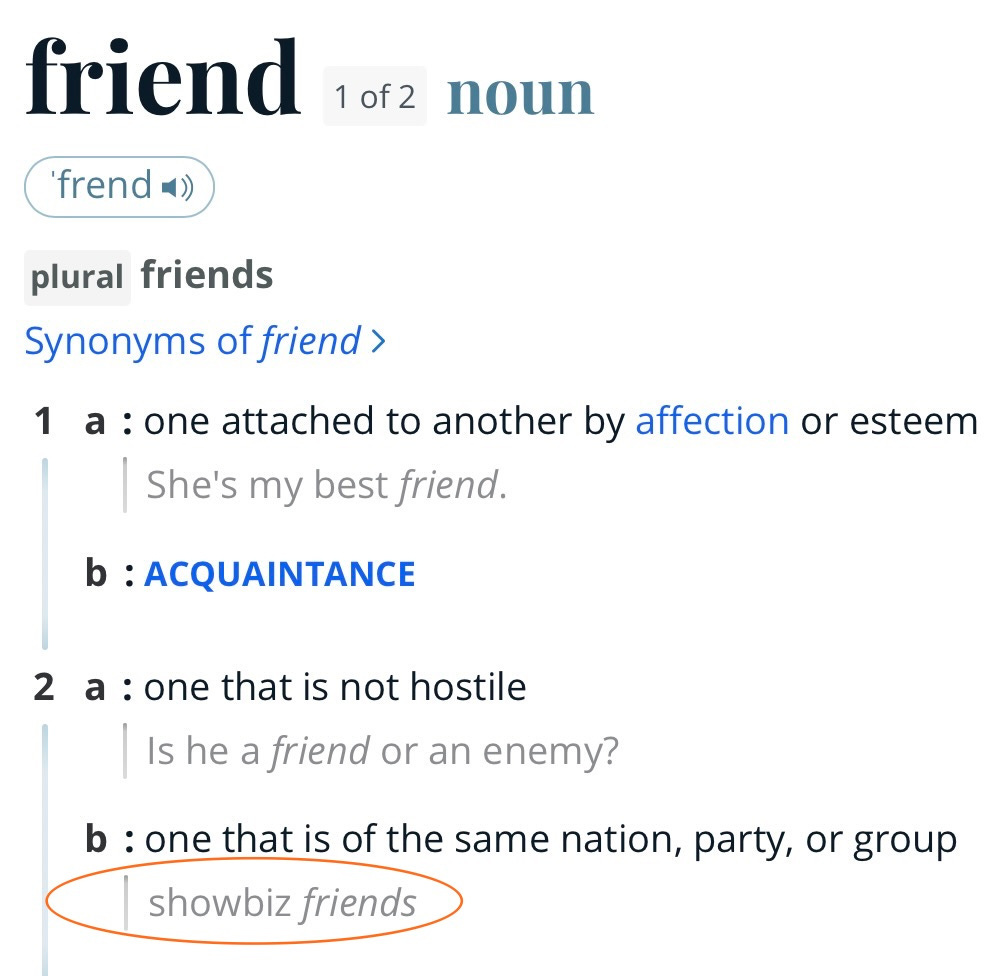 Note the example used below in Merriam-Webster in its lowest definition of “friend”: Showbiz friends.