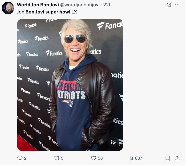 Seriously, Jon Bon Jovi — we get you’re a PATRIOTS fan now 🙄 . . . but, introducing the Patriots . . . at the Super Bowl? Good thing Bon Jovi is playing MSG on the summer tour and not METLIFE in Jersey. You’re now dead to Jersey — and yes, we know you named an album after us.