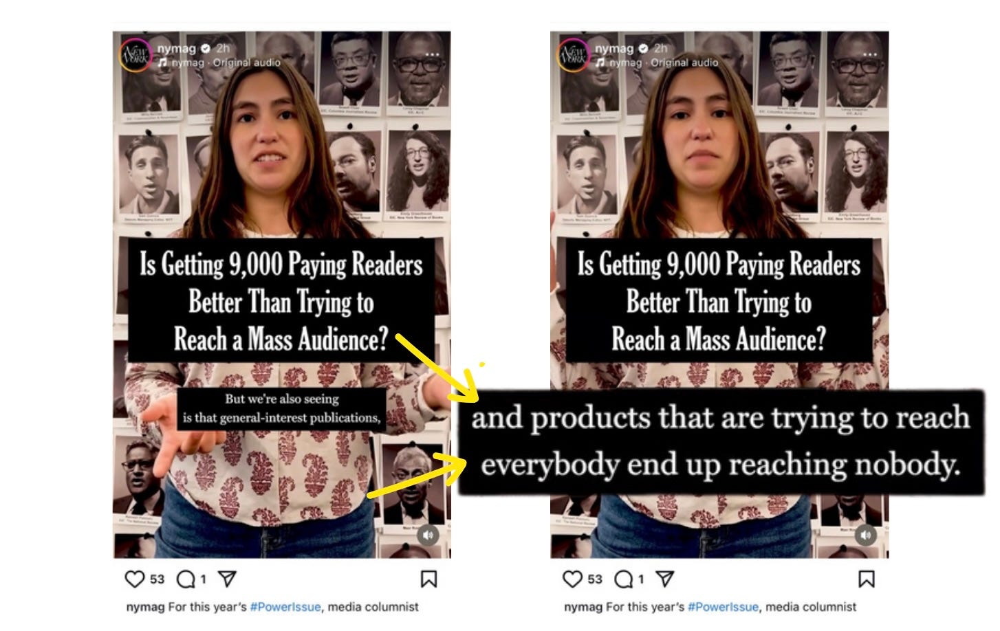 New York posted this on Instagram from the story’s writer Charlotte Klein. She makes the point that, today, 9,000 paid subscribers are more valuable than “products that are trying to reach everybody,” she says, and “end up reaching nobody.”