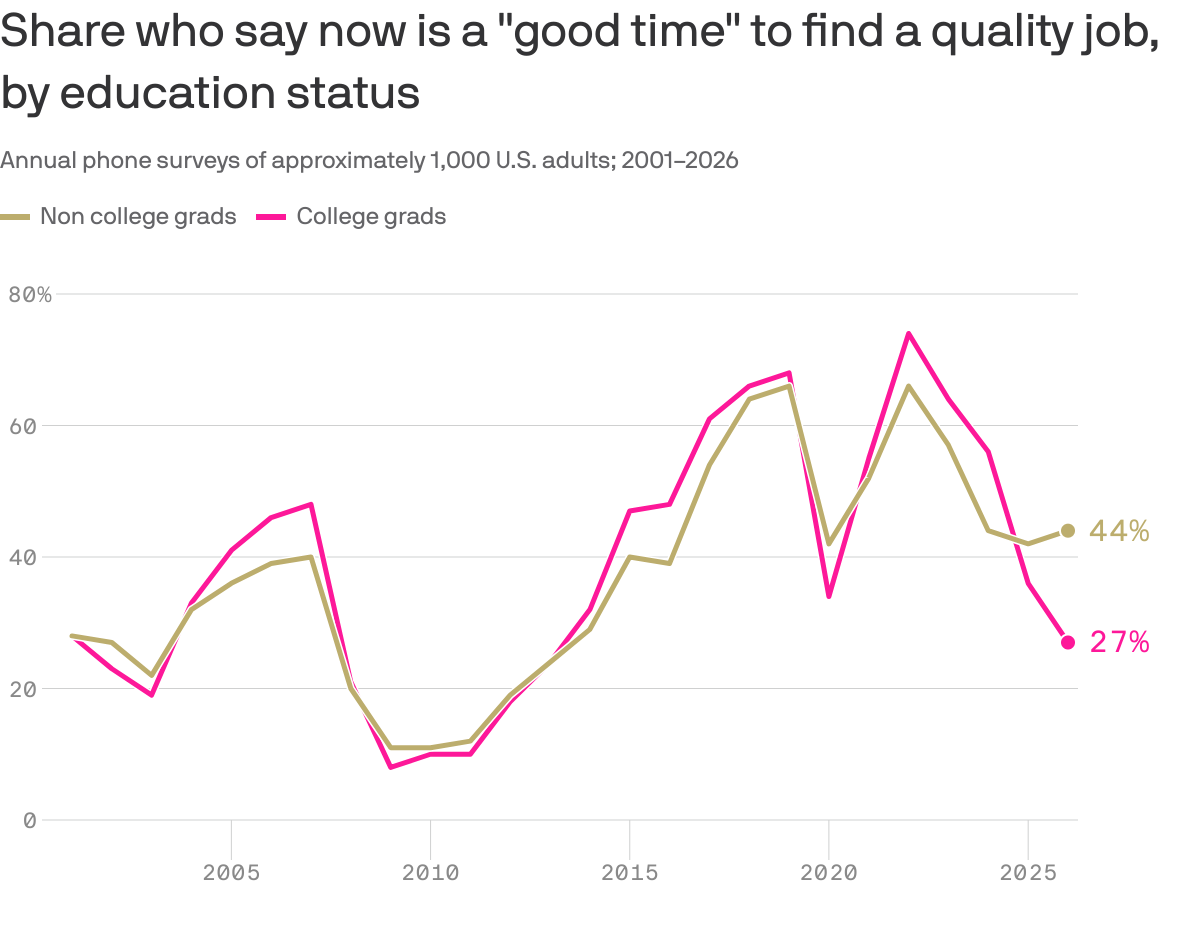 Granted, this is just a GALLUP poll of 1,000 people, but the new divergence in outlook among these groups is notable, as is the 27% figure from the college grad crowd being lower than during Covid and the lowest since 2013.