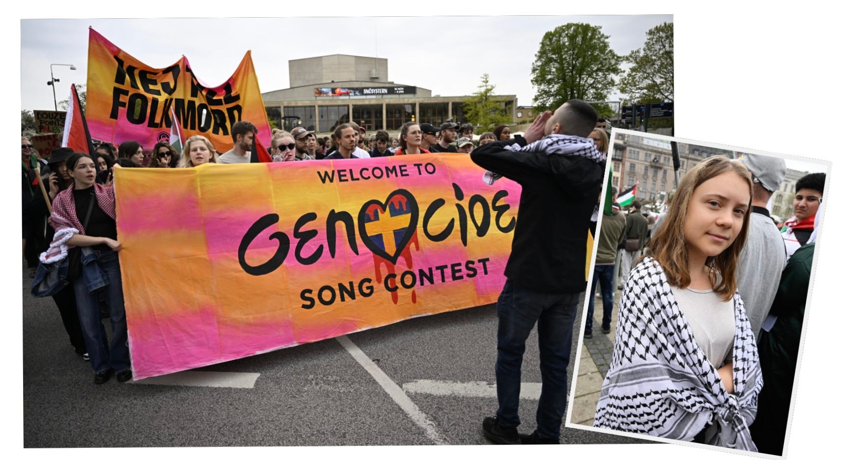 Thunberg was draped in a keffiyeh (a checkered scarf currently associated with the pro-Palestine movement) — the same garment the EBU apologized for when it was worn on stage by Swedish singer Eric Saade at the Tuesday semi-final despite a ban on political gestures in performances.