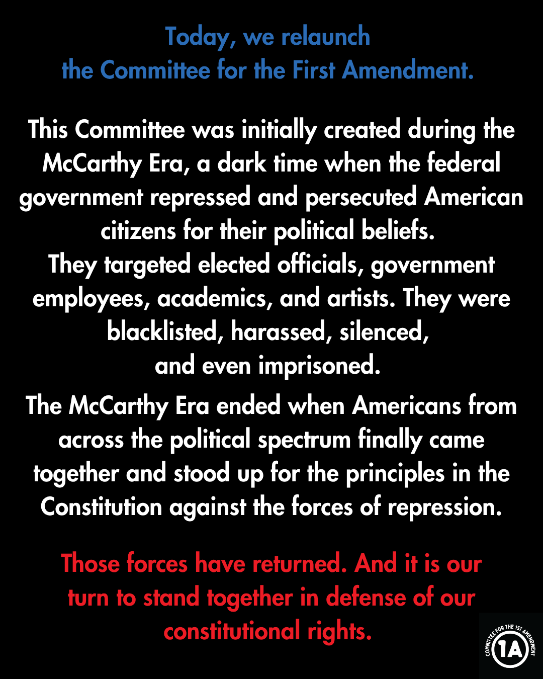 The Committee’s official functions are still taking shape. However, a call to action to new members states, “The Committee for the First Amendment is being relaunched as a united front by the entertainment industry against censorship, intimidation, and fear.”