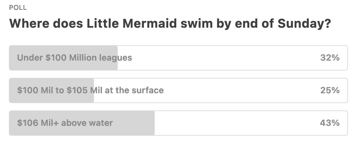 Well, we’ve got a weekend of extremes on Little Mermaid thinking it seems… with the bulls winning but not by much - here’s where ya’ll landed. Happy moviegoing everyone!