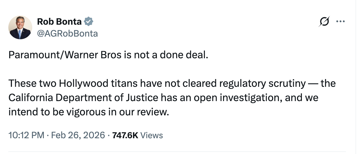 Death by poison or death by firing squad is still death. But even after the news that Paramount had won the bidding for Warner Bros. Discovery, as Netflix bowed out, it’s not too late to fight — as California Attorney General Rob Bonta intends to do: