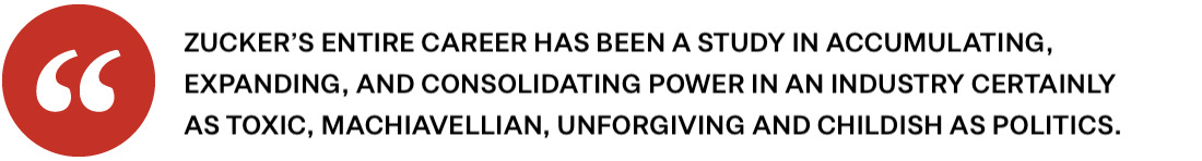 And this may be true. Zucker’s entire career has been a study in accumulating, expanding, and consolidating power in an industry certainly as toxic, Machiavellian, unforgiving and childish as politics. He not only has risen as all others in TV have fallen, but — in the face of failure, ridicule, and a loss of his all-important power base when Comcast acquired NBC from GE — risen again. Zucker may be the only true television executive of his generation to have succeeded (at least up until now) in absolute terms.