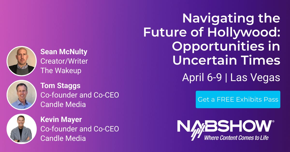 Come join me, Kevin Mayer and Tom Staggs tomorrow at the NAB convention at 11:30 a.m. in Vegas (space W217-W218) for this dive into all things CANDLE MEDIA, the state of TV buying, the YOUTUBE business, the future of studios, theme parks and more.