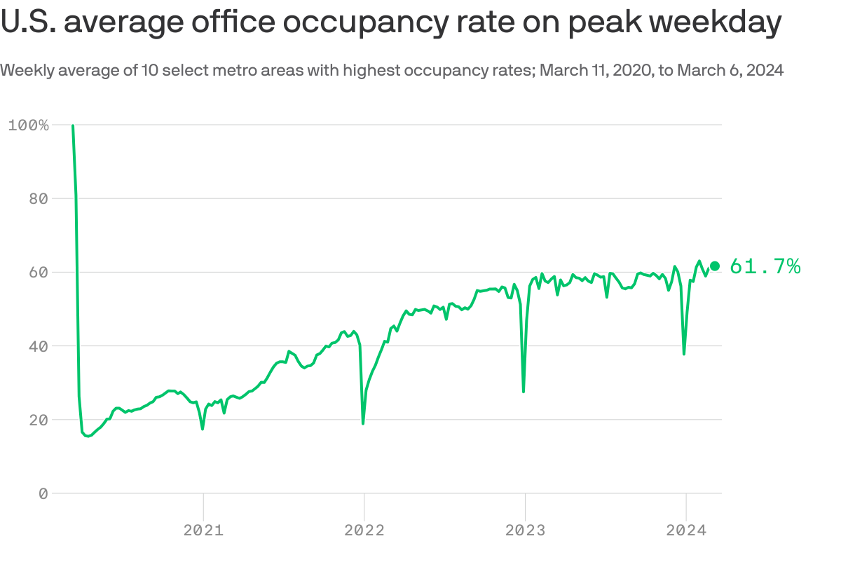 This is what office occupancy rates look like, four years since Covid (across buildings in 10 metro areas). Friday office attendance in 2024? About 35%.