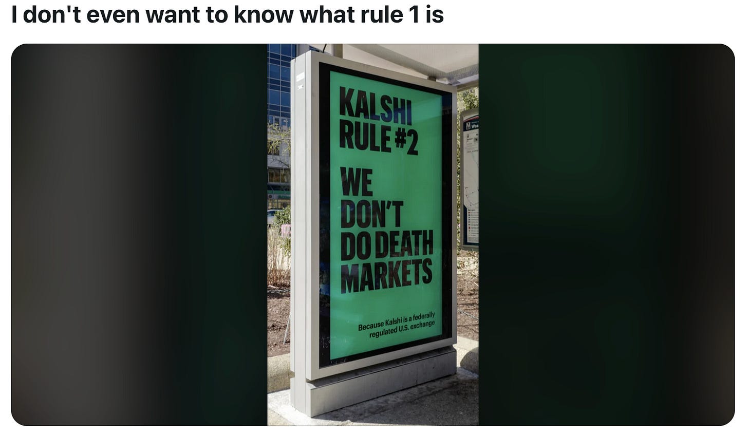 BUT: Then again, when Pete Hegseth’s investment broker reportedly approached BLACKROCK about buying in a defense company exchange-traded fund (ETF) in the weeks leading up to the Iran war, according to the FT, I mean — what’s wrong with a few death markets?