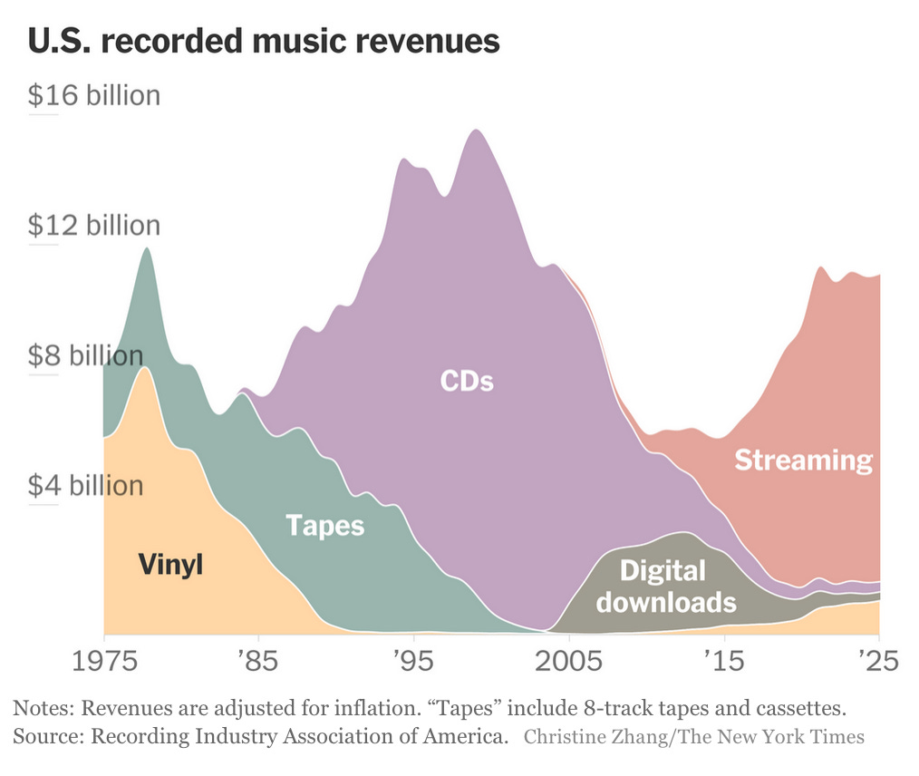 YEAH: We’ve all seen the datapoint that vinyl record sales had a big year in 2025 (well, big for vinyl) — pretty much thanks to Taylor Swift — but this overall chart👇 from the NY Times on the evolution of U.S. music industry revenue is pretty great to put the U.S. recorded music business’ evolution in perspective.