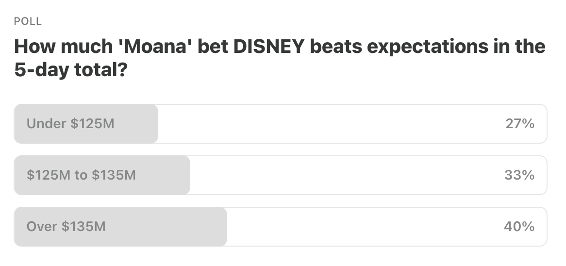 Lotta folks with kids who have streamed Moana way too many times out there. I’m actually gonna go with the 33% this week.