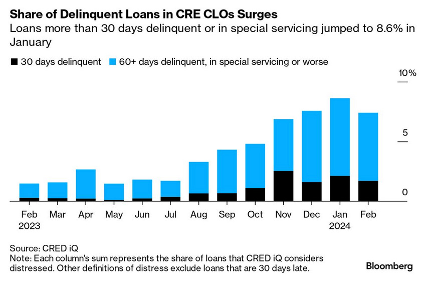 ERR: Think folks holding commercial real estate debt are having a fun 2024? You know it’s bad when Bloomberg is flashing the 🚨 on this, whose core issue (the CRE CLO’s here) sounds a lot like 2008 — wrapping up crappy debt in larger worthless packaging that no one now wants (albeit on a different scale).