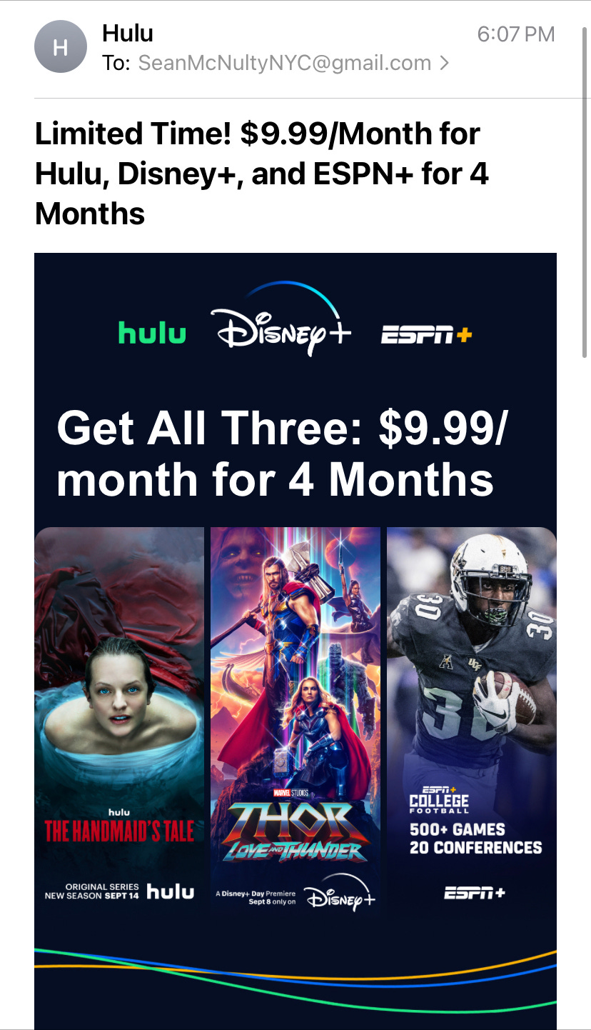 And in a great sign of unintended synergy with our Ankler Podcast discussion on Friday - cue DISNEY joining The Great Q3 2022 Streaming Discounting Battle right on time in 3, 2…