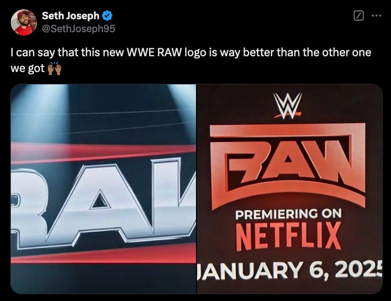 DO-OVER: For my branding folks — never let it be said that the WWE doesn’t listen to the people. Meet your new RAW logo when the show launches on NETFLIX next month (previous attempt last month is on the right). Good call.