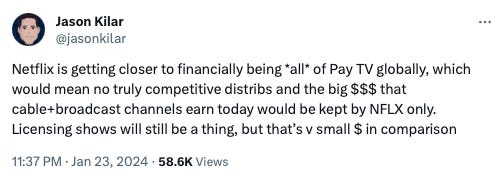 The popular narrative among entertainment press and pundits in 2019 was that Netflix would swallow the entertainment world and become all TV. Then 2022 happened and Netflix fell precipitously, while Disney rose. A year later, the traditional studios began their subsequent slides, including Disney, who had to change CEOs. Now, at the start of 2024, some — including the architect of Project Popcorn — are again speculating that Netflix will soon one day be “all TV”: