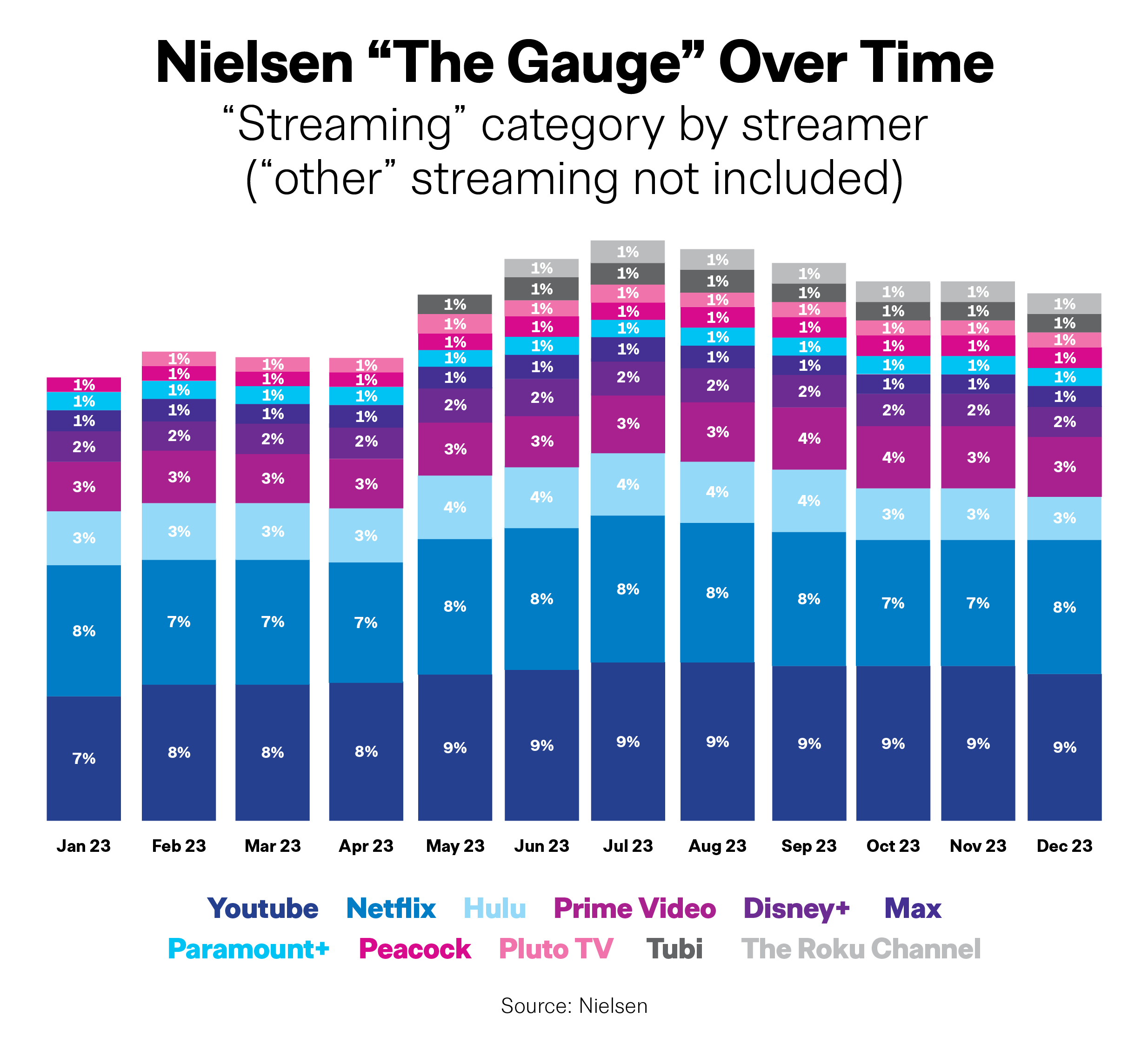 Thing is, it’s just not really true. As much as we talk about Netflix being the biggest streamer in Hollywood, pundits and media tend to overlook the elephant in the room. For example, here’s Nielsen’s monthly usage tracker The Gauge: