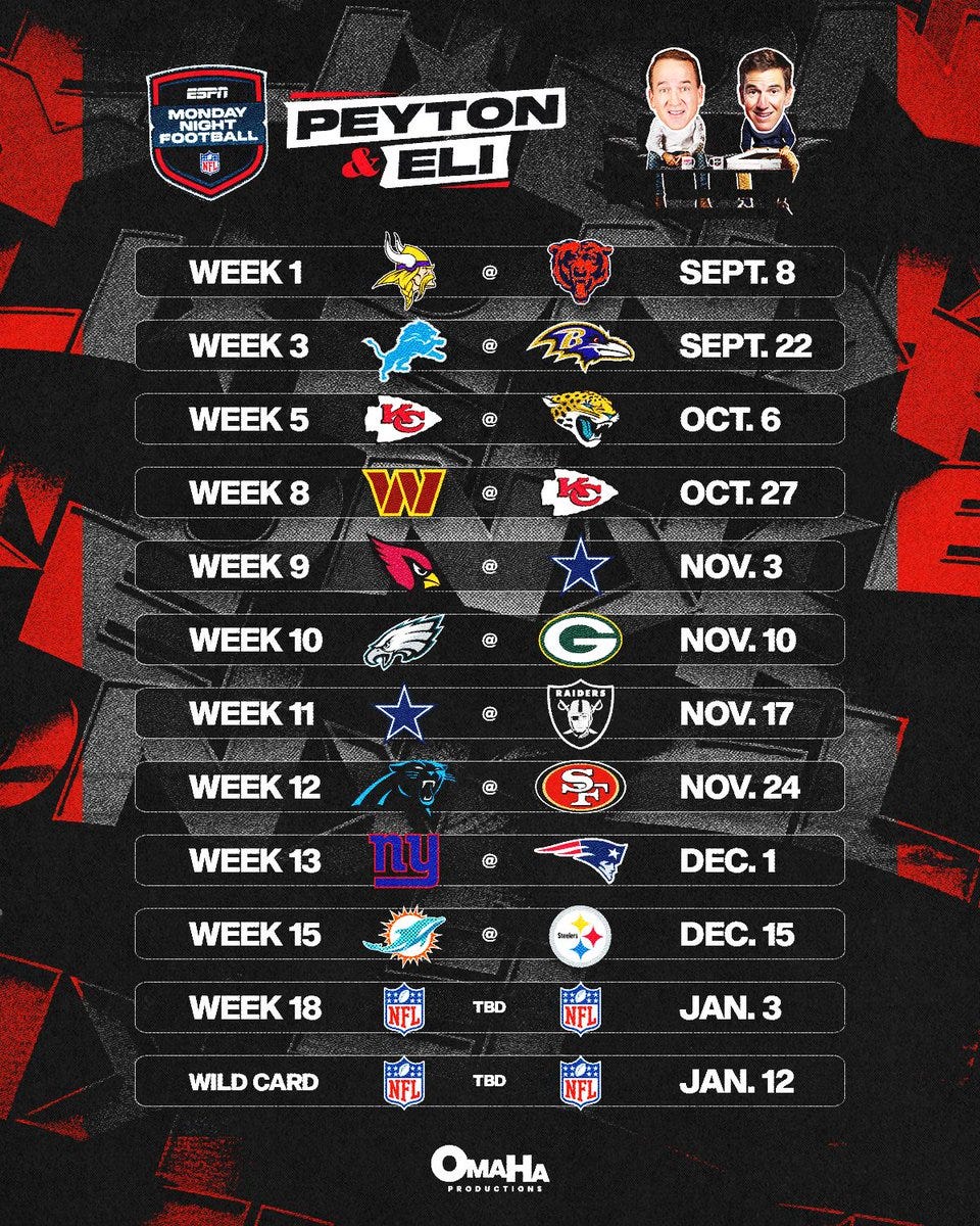 PLUS: Here are the 12 MNF games getting Manningcasts this season on ESPN2 & D2C:
