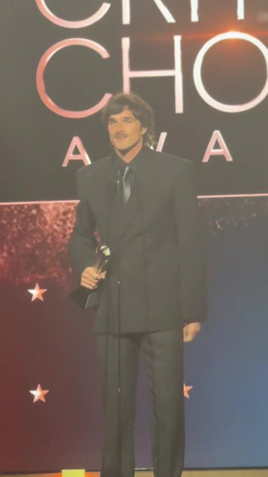 But first, a few takeaways from last night’s Critics Choice Awards, which surely felt a bit like being shot out of a rocket after two blissfully quiet weeks of holiday break. (Pity poor Leonardo DiCaprio, who was held over on his yacht trip in St. Bart’s with Jeff Bezos due to airspace restrictions near Venezuela, and barely made it to the awards show on time.) Critics Choice is the start to a jam-packed week of awards events on both coasts, all leading to the Golden Globes this Sunday. On tomorrow’s pod, Christopher Rosen will preview the busy week ahead, and I’ll also share the Substack Live conversation we had immediately after the Critics Choice Awards ended last night. (Missed it? Make sure you’re a Prestige Junkie After Party paid subscriber and catch up!)
